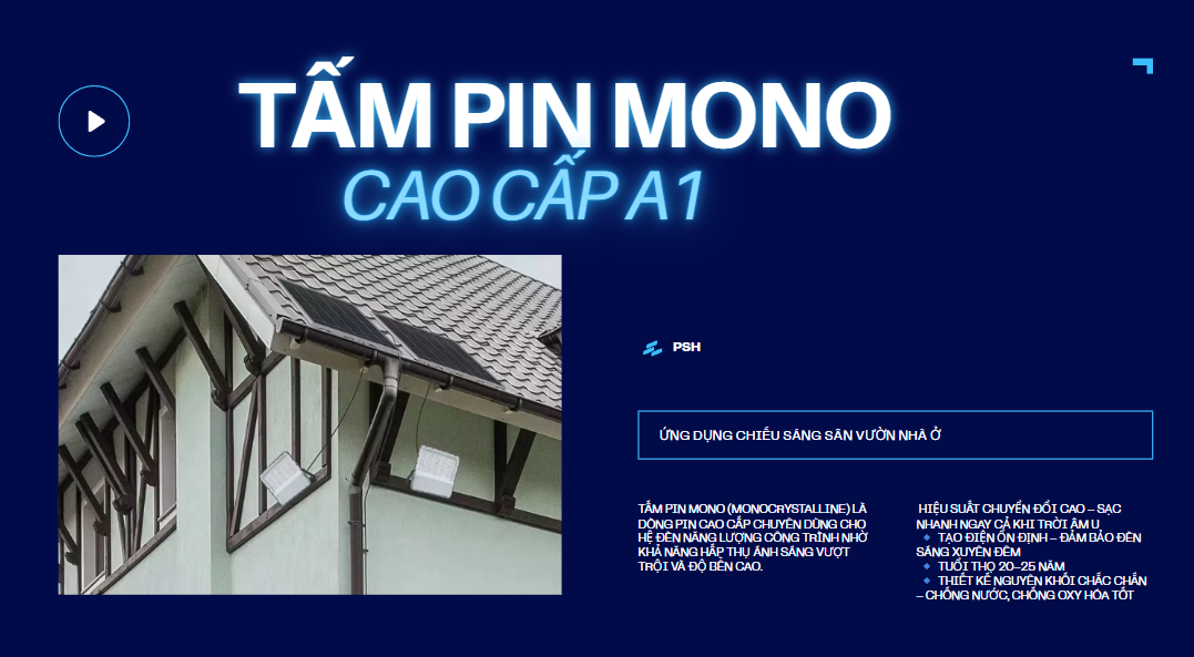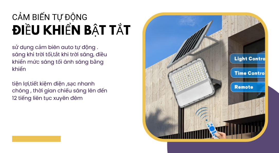 Nhờ chế độ tự động này, đèn giúp tiết kiệm tối đa năng lượng, kéo dài tuổi thọ pin và đảm bảo chiếu sáng hiệu quả suốt đêm. Công nghệ cảm biến ánh sáng đặc biệt phù hợp cho các khu vực công cộng, đường nông thôn, sân vườn, khu dân cư và các công trình không có điện lưới.
