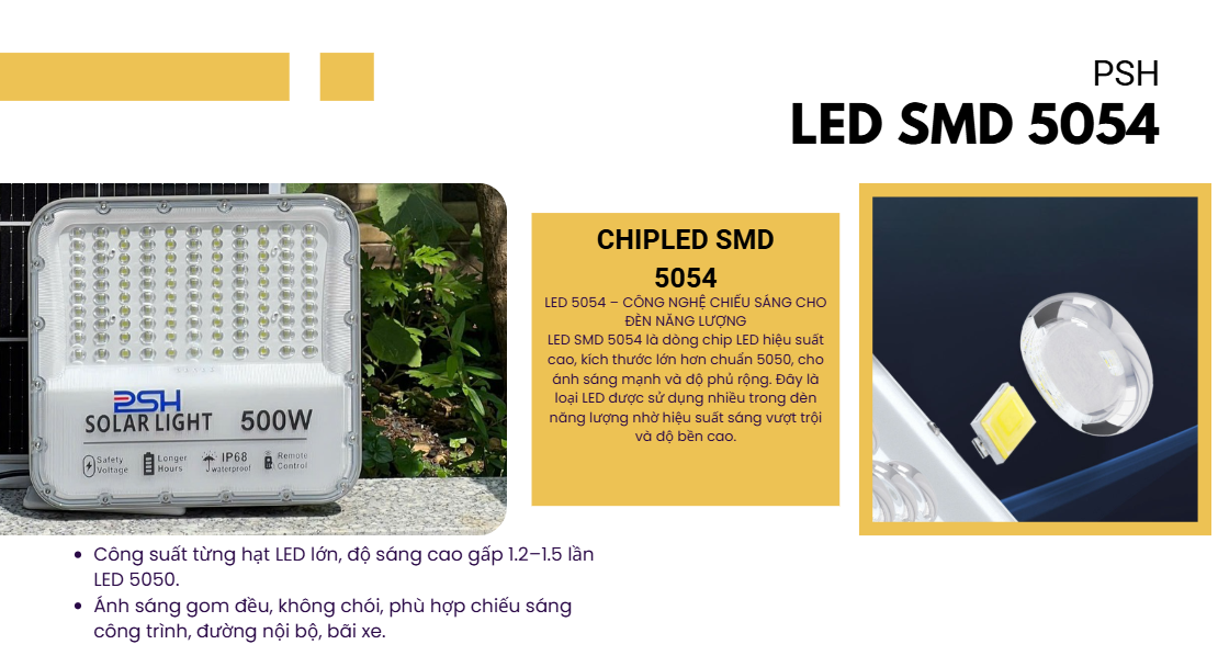 Cung cấp nguồn sáng mạnh mẽ, đèn sử dụng LED SMD 5054 chất lượng cao .mang lại độ sáng siêu vượt trội và đồng thời tiết kiệm năng lượng. Điều này giúp giảm rủi ro giảm hiệu suất và tăng tuổi thọ của đèn lên đến 50.000 đến 100.000 giờ.