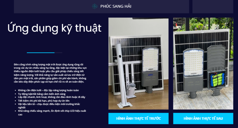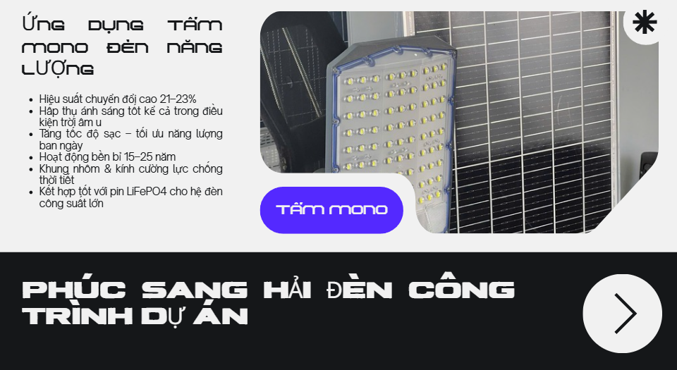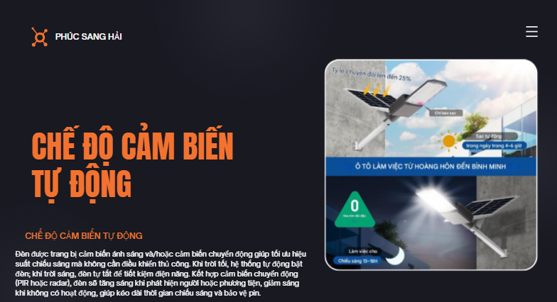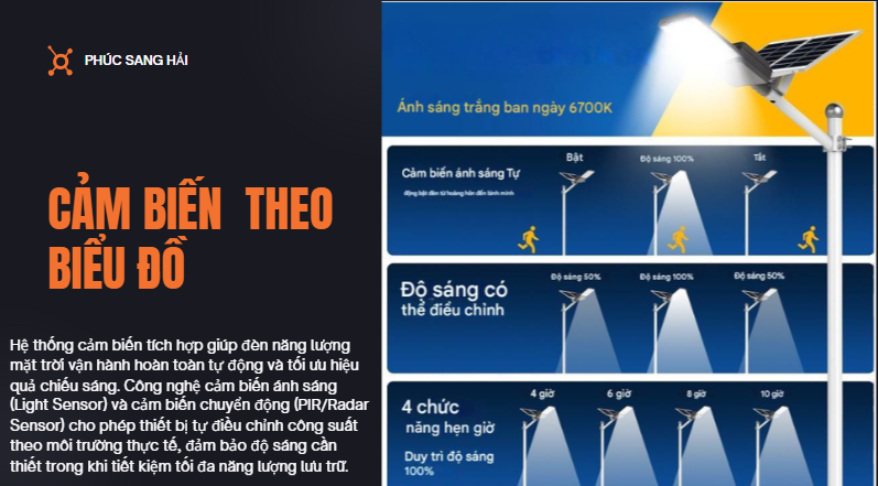 Nhờ chế độ tự động này, đèn giúp tiết kiệm tối đa năng lượng, kéo dài tuổi thọ pin và đảm bảo chiếu sáng hiệu quả suốt đêm. Công nghệ cảm biến ánh sáng đặc biệt phù hợp cho các khu vực công cộng, đường nông thôn, sân vườn, khu dân cư và các công trình không có điện lưới.