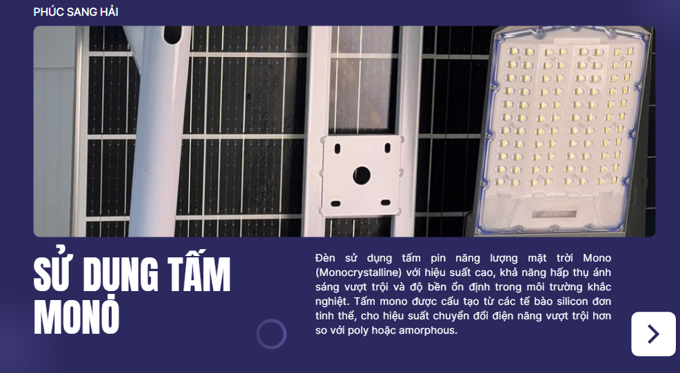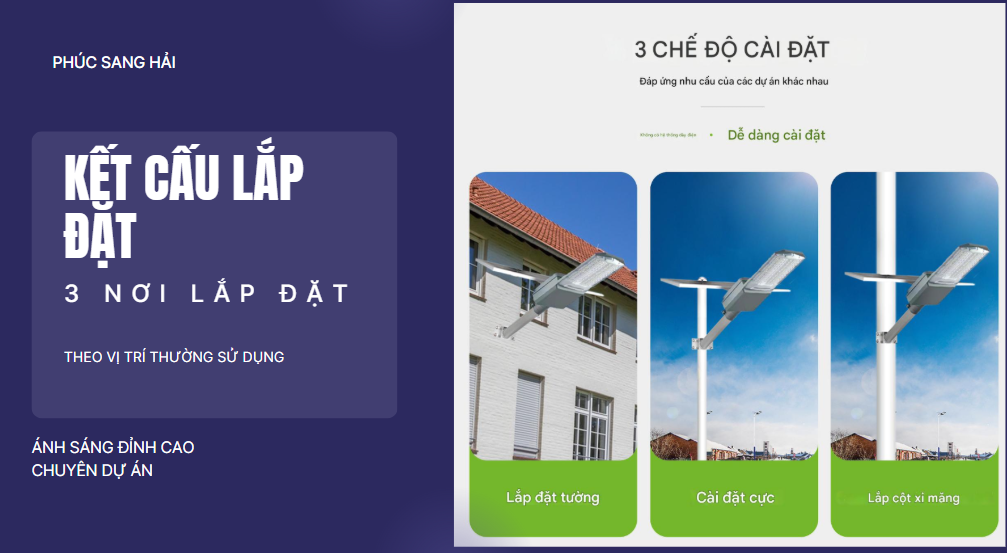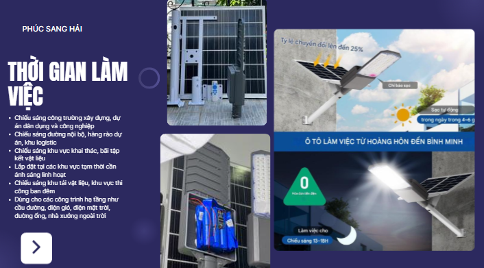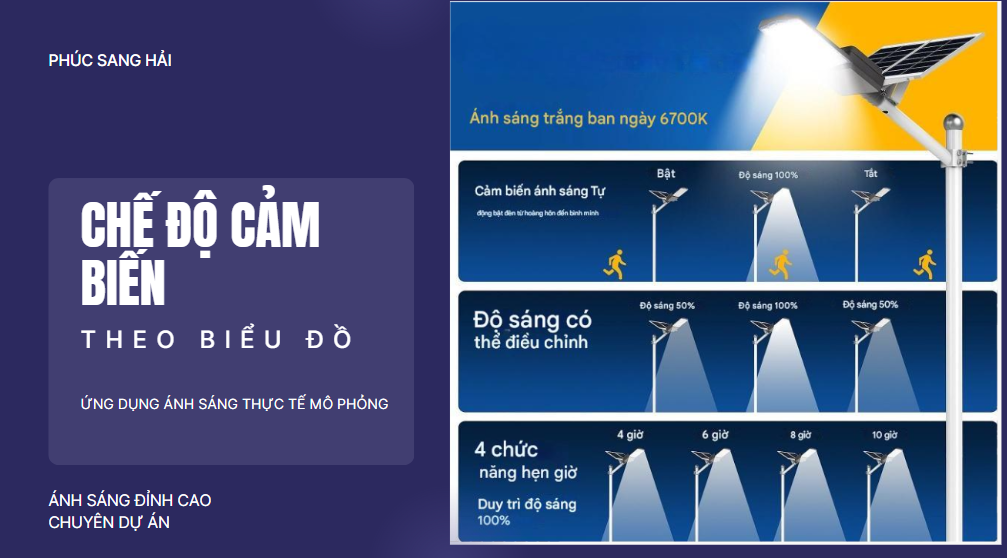Nhờ chế độ tự động này, đèn giúp tiết kiệm tối đa năng lượng, kéo dài tuổi thọ pin và đảm bảo chiếu sáng hiệu quả suốt đêm. Công nghệ cảm biến ánh sáng đặc biệt phù hợp cho các khu vực công cộng, đường nông thôn, sân vườn, khu dân cư và các công trình không có điện lưới.