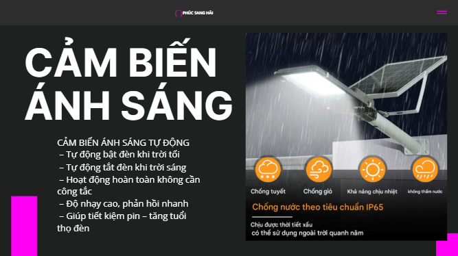 Đèn năng lượng mặt trời được trang bị chế độ cảm biến ánh sáng thông minh, cho phép tự động bật khi trời tối và tự động tắt khi trời sáng mà không cần bất kỳ thao tác thủ công nào. Hệ thống cảm biến quang học nhận biết cường độ ánh sáng môi trường xung quanh, từ đó điều khiển đèn bật/tắt một cách chính xác và ổn định.