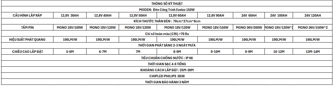 CẤU HÌNH LẮP RÁP Đèn Công Trình Evolex 150W HỆ 12,8V-24V-25,6V