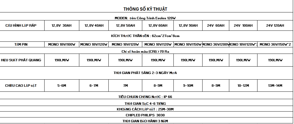 CẤU HÌNH LẮP RÁP Đèn Công Trình Evolex 120W HỆ 12,8V-24V-25,6V