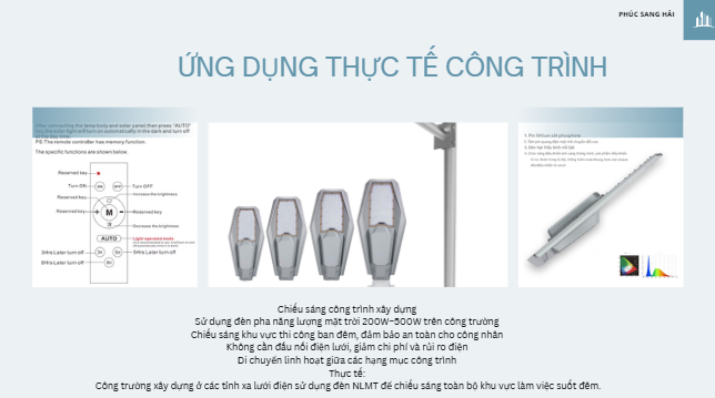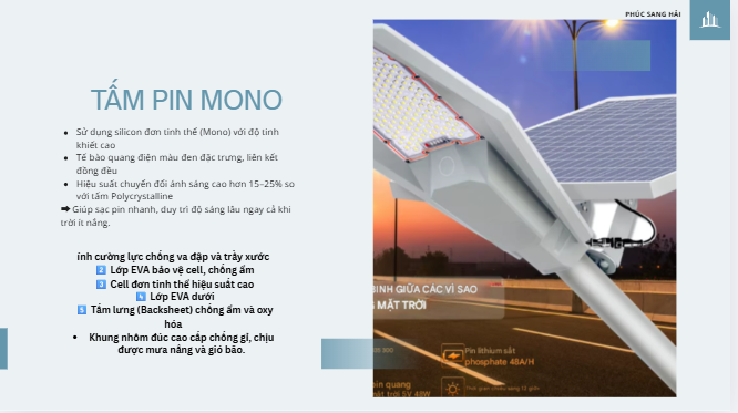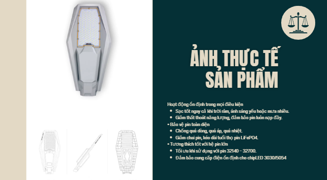 Nhờ chế độ tự động này, đèn giúp tiết kiệm tối đa năng lượng, kéo dài tuổi thọ pin và đảm bảo chiếu sáng hiệu quả suốt đêm. Công nghệ cảm biến ánh sáng đặc biệt phù hợp cho các khu vực công cộng, đường nông thôn, sân vườn, khu dân cư và các công trình không có điện lưới.