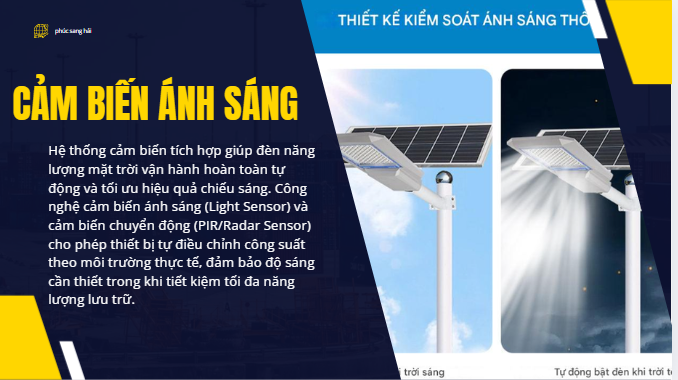 Đèn năng lượng mặt trời được trang bị chế độ cảm biến ánh sáng thông minh, cho phép tự động bật khi trời tối và tự động tắt khi trời sáng mà không cần bất kỳ thao tác thủ công nào. Hệ thống cảm biến quang học nhận biết cường độ ánh sáng môi trường xung quanh, từ đó điều khiển đèn bật/tắt một cách chính xác và ổn định.