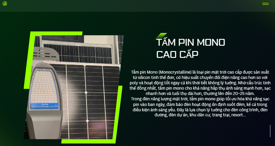 Nhờ chế độ tự động này, đèn giúp tiết kiệm tối đa năng lượng, kéo dài tuổi thọ pin và đảm bảo chiếu sáng hiệu quả suốt đêm. Công nghệ cảm biến ánh sáng đặc biệt phù hợp cho các khu vực công cộng, đường nông thôn, sân vườn, khu dân cư và các công trình không có điện lưới.