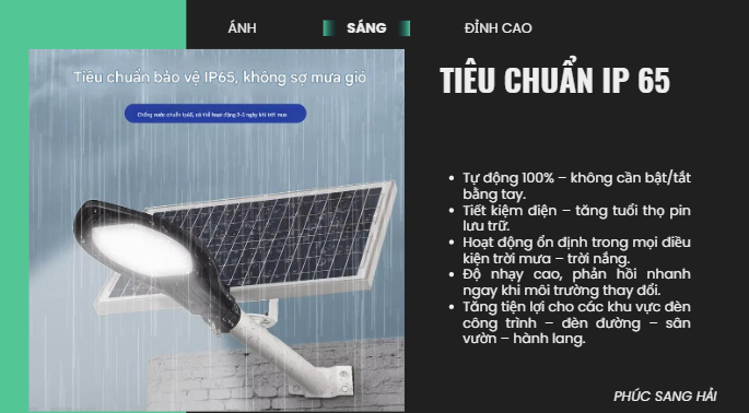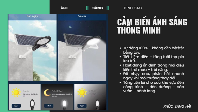 Đèn năng lượng mặt trời được trang bị chế độ cảm biến ánh sáng thông minh, cho phép tự động bật khi trời tối và tự động tắt khi trời sáng mà không cần bất kỳ thao tác thủ công nào. Hệ thống cảm biến quang học nhận biết cường độ ánh sáng môi trường xung quanh, từ đó điều khiển đèn bật/tắt một cách chính xác và ổn định.