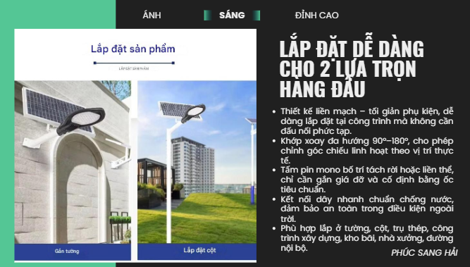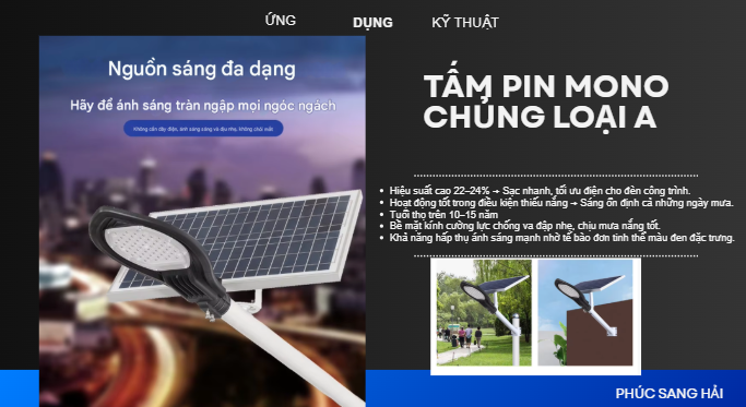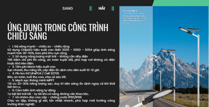 Nhờ chế độ tự động này, đèn giúp tiết kiệm tối đa năng lượng, kéo dài tuổi thọ pin và đảm bảo chiếu sáng hiệu quả suốt đêm. Công nghệ cảm biến ánh sáng đặc biệt phù hợp cho các khu vực công cộng, đường nông thôn, sân vườn, khu dân cư và các công trình không có điện lưới.
