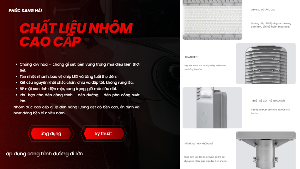 Ứng dụng rộng rãi: ĐÈN ĐƯỜNG CÔNG TRÌNH CAO ÁP 100W phù hợp chiếu sáng đường phố, khu đô thị, khu dân cư, bãi đỗ xe và các dự án ngoài trời quy mô lớn, mang lại hiệu quả chiếu sáng đồng đều và bền vững.
