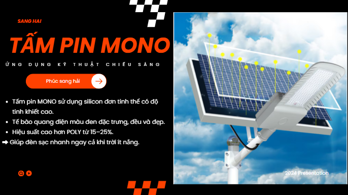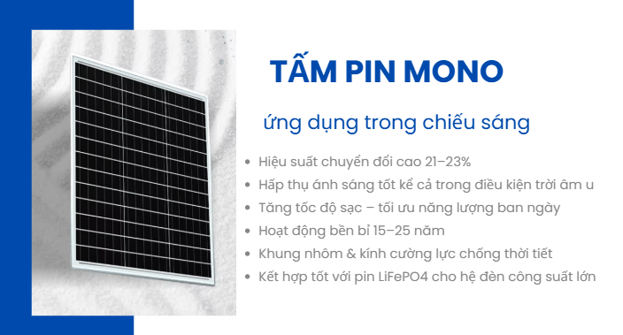 Hiệu suất hấp thụ ánh sáng vượt trội: ĐÈN ĐƯỜNG CÔNG TRÌNH CAO ÁP 100W sử dụng tấm pin Mono (Monocrystalline) với hiệu suất chuyển đổi ánh sáng mặt trời thành điện năng lên đến 22%, cao hơn đáng kể so với tấm pin Polycrystalline thông thường.