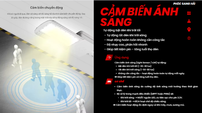 Tích hợp cảm biến ánh sáng: Đèn được trang bị cảm biến ánh sáng tự động bật sáng vào ban đêm và tắt khi trời sáng.