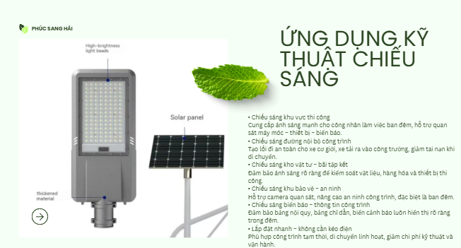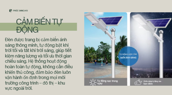 Nhờ chế độ tự động này, đèn giúp tiết kiệm tối đa năng lượng, kéo dài tuổi thọ pin và đảm bảo chiếu sáng hiệu quả suốt đêm. Công nghệ cảm biến ánh sáng đặc biệt phù hợp cho các khu vực công cộng, đường nông thôn, sân vườn, khu dân cư và các công trình không có điện lưới.