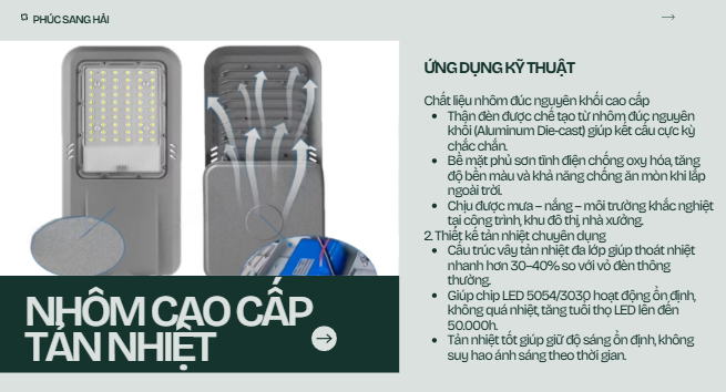 Thân đèn làm bằng hợp kim nhôm đúc cực kỳ chắc chắn