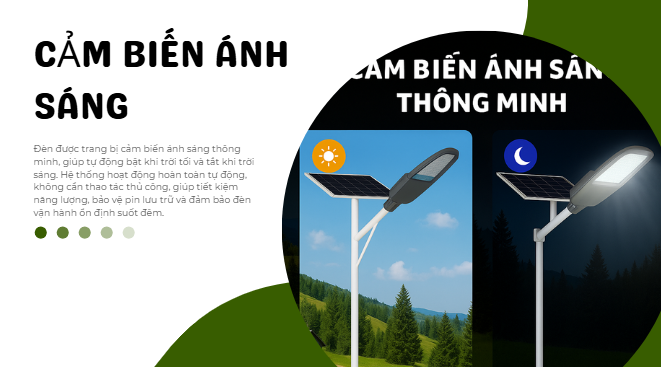 Đèn năng lượng mặt trời được trang bị chế độ cảm biến ánh sáng thông minh, cho phép tự động bật khi trời tối và tự động tắt khi trời sáng mà không cần bất kỳ thao tác thủ công nào. Hệ thống cảm biến quang học nhận biết cường độ ánh sáng môi trường xung quanh, từ đó điều khiển đèn bật/tắt một cách chính xác và ổn định.