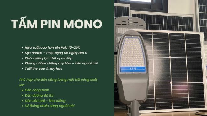 Là một thành phần quan trọng trong bộ Đèn Công Trình Ram 2.5 500W, tấm pin năng lượng mặt trời được nhập khẩu theo tiêu chuẩn chất lượng cao và trải qua quy trình kiểm định chặt chẽ. Tấm pin năng lượng mặt trời này đóng vai trò quan trọng trong việc cung cấp điện cho bộ đèn, đảm bảo tuổi thọ của cả bộ đèn và pin lithium lưu trữ.