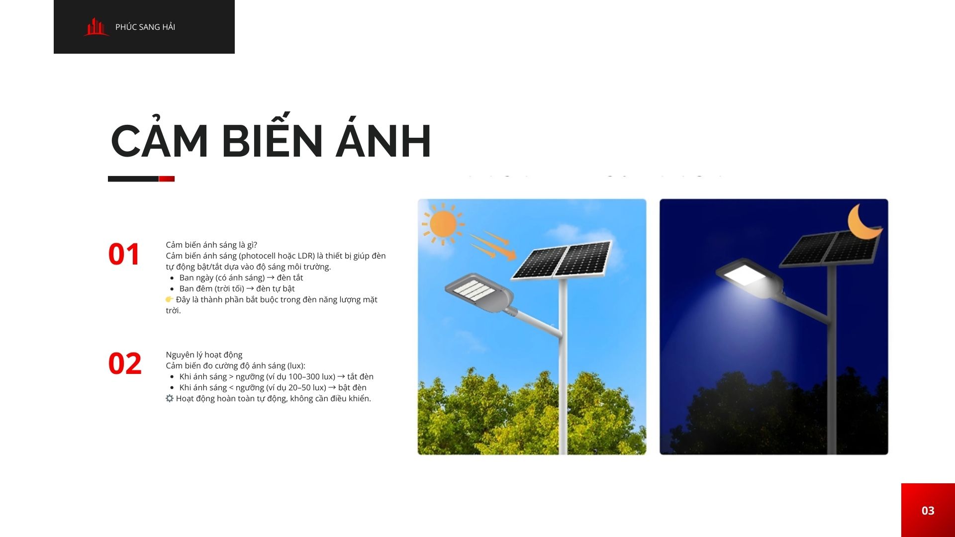Cảm biến này trên đèn đường công trình năng lượng mặt trời Đèn Công Trình Philips Tiger 100W hoạt động dựa trên độ sáng của ánh sáng mặt trời. Khi trời sáng, cảm biến sẽ tự động tắt đèn và khi trời chuyển tối, đèn sẽ tự động bật sáng. Bạn không cần phải lo lắng về việc bật tắt đèn, mọi thứ đều diễn ra tự động và thuận tiện